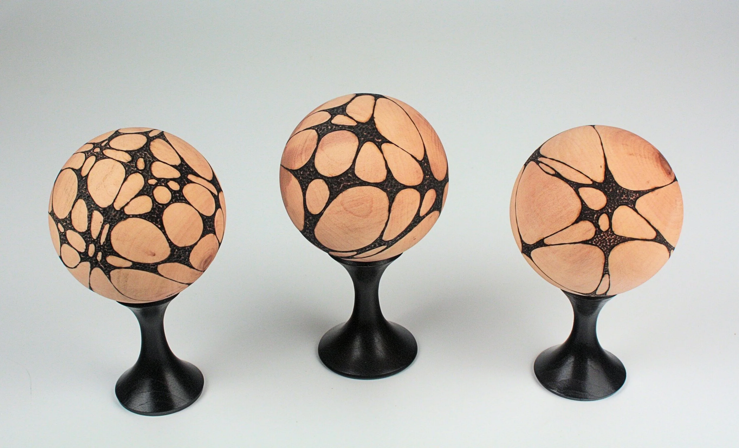 “Mars Balls” - #11840 - 1, #11840 - 2, #11840 - 3, - turned Southern Red Bud with Pyrography - 3” Dia. plus stand. Purchased individually $160.00 each, as a set $400.00.